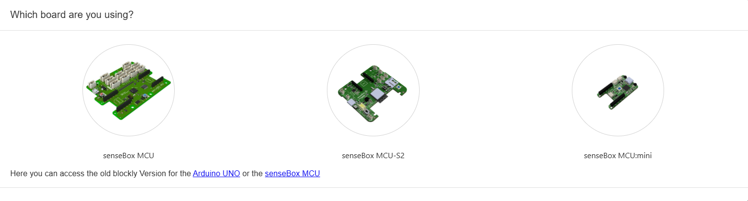 Öffne Blockly für senseBox in deinem Browser unter https://blockly.sensebox.de. Dort musst du zuerst deine senseBox-Version auswählen.