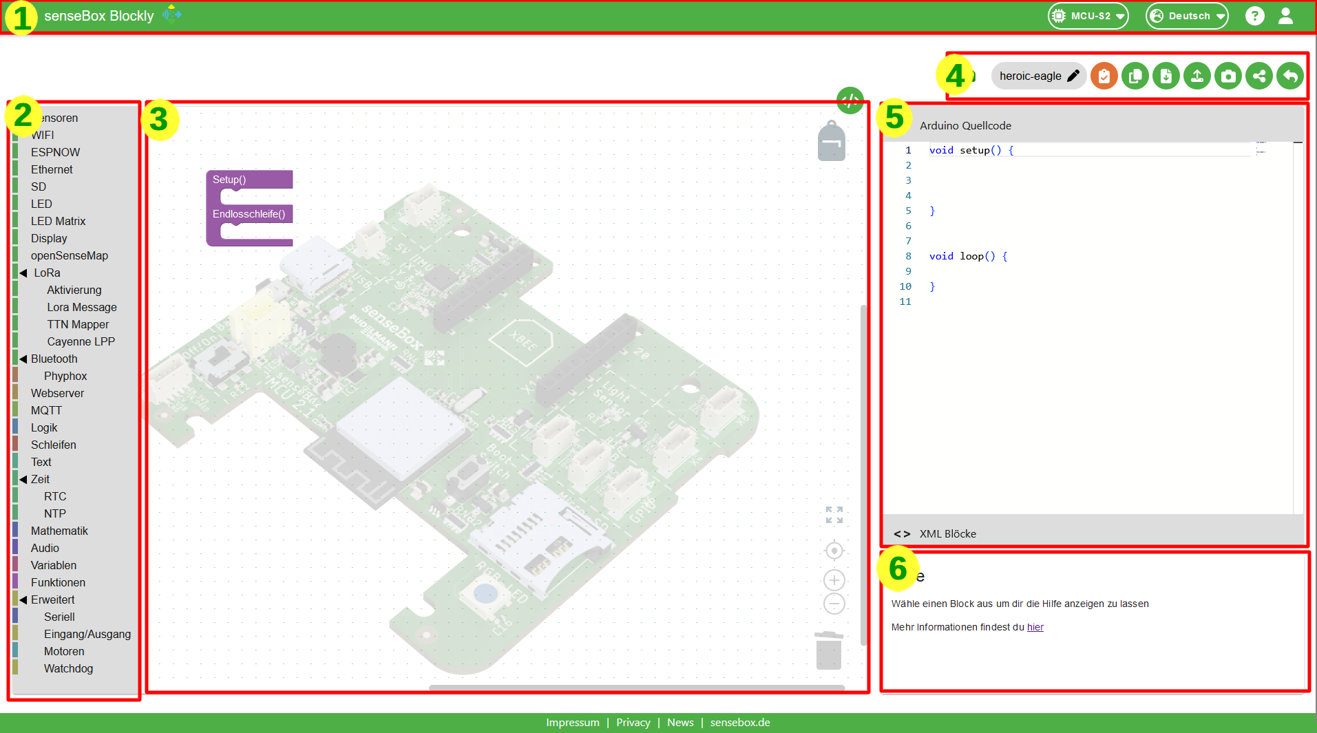 Nachdem du deine senseBox-Version ausgewählt hast, befindest du dich auf der Programmieroberfläche. Diese lässt sich in sechs wichtige Bereiche einteilen.