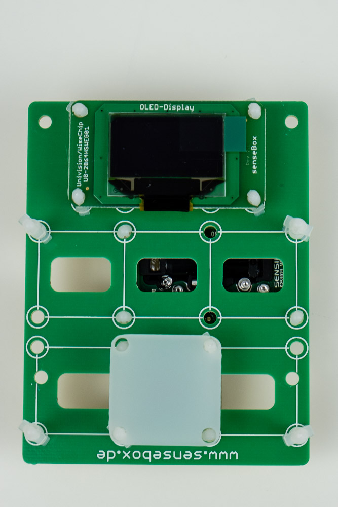 An die Sensorhalterung werden das Display, der CO2-Sensor und die RGB-LED angebracht. Später wird sie mit der Hauptplatine verbunden und getestet.