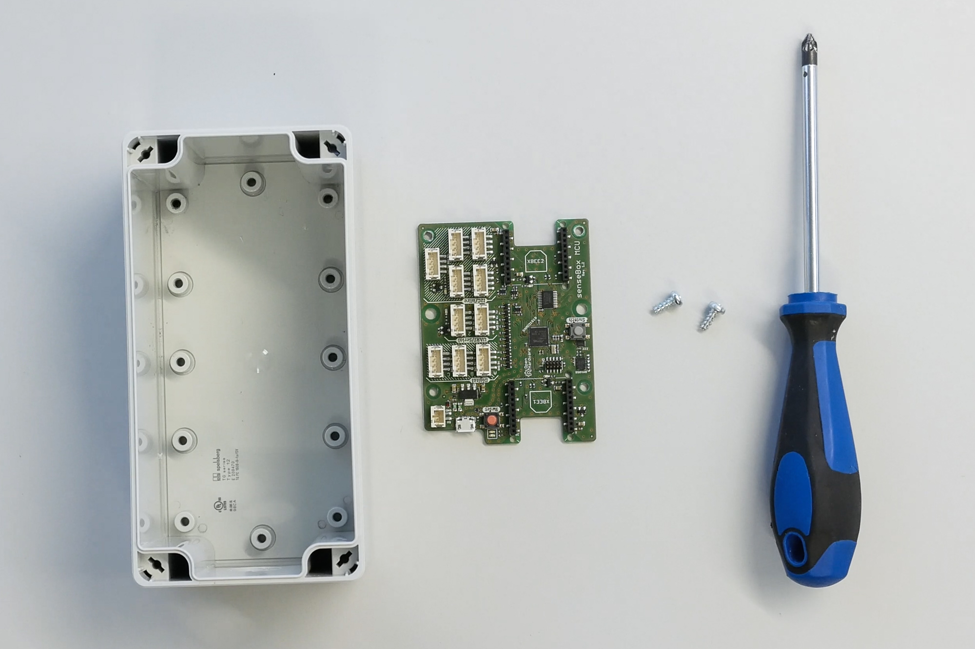 Nun schraubst du die Acryllplatte in das Gehäuse fest. Achte darauf, dass die Öffnung für den USB-Anschluss zur Öffnung des Gehäuses zeigt. Danach kannst du mit den schwarzen Schrauben die senseBox MCU auf die Acryllplatte befestigen. Hier muss wieder darauf geachtet werden, dass der USB-Anschluss zur Öffnung des Gehäuses ausgerichtet ist.