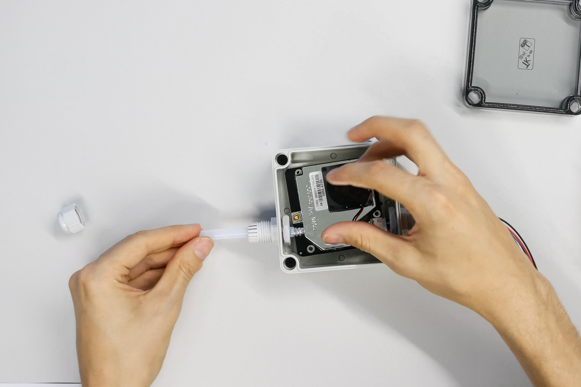 Die außenliegenden Sensoren, also der Sensor für Temperatur und Luftfeuchtigkeit, sowie der Feinstaubsensor werden jetzt an die MCU angeschlossen. Dafür nehmen wir zuerst das Kabel aus dem Strahlenschutz und fädeln es durch die letzte Kabelverschraubung in das Gehäuse.