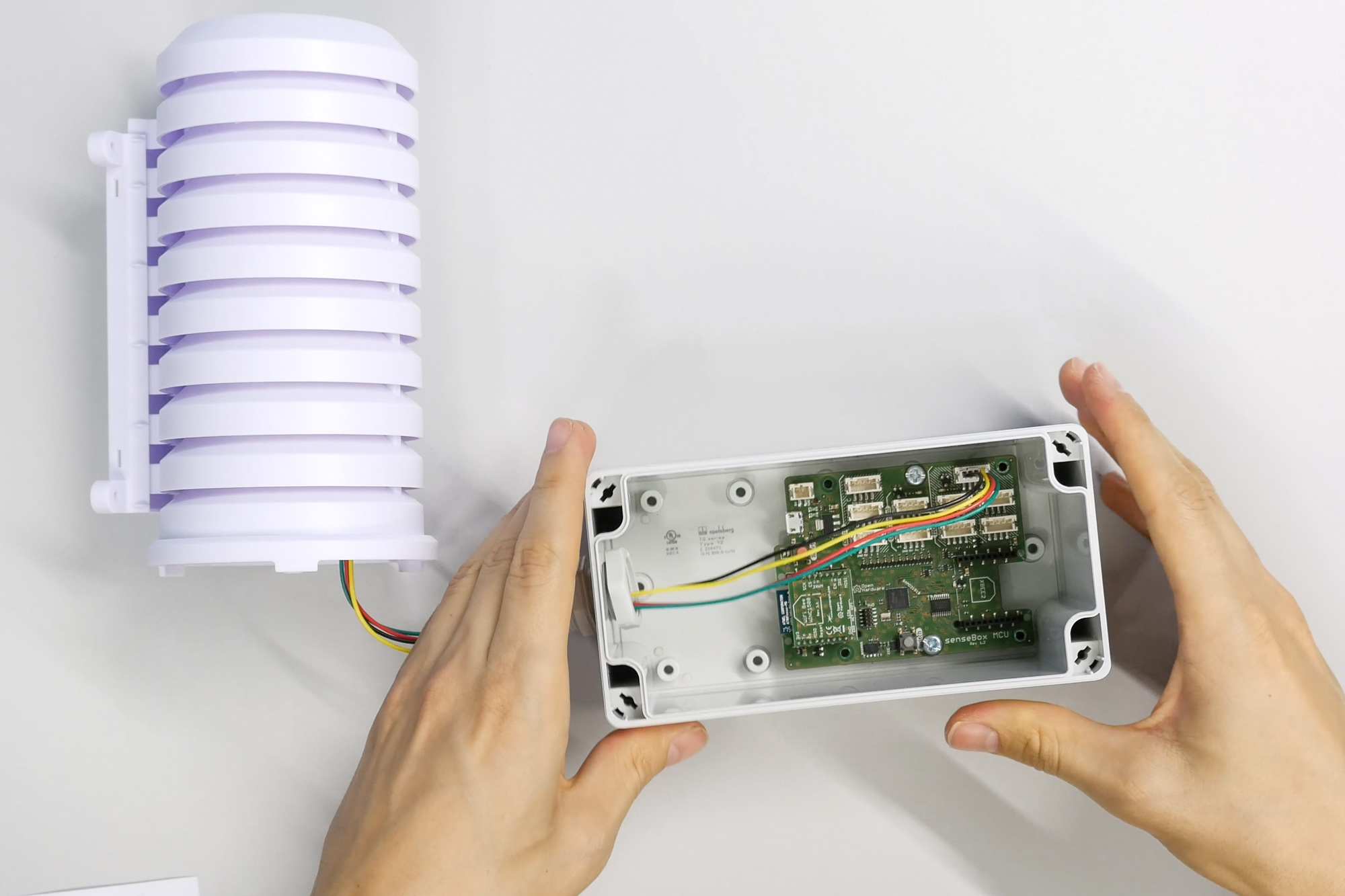 Der Sensor kann nun zusätzlich noch mit etwas Klebeband oder einem Kabelbinder am Ständer befestigt werden. Das Strahlenschutzgehäuse sorgt später für eine gute Luftzirkulation und schützt den Sensor gleichzeitig vor der Witterung. Nun kann das Strahlenschutzgehäuse noch zusammengesteckt werden und später wird der Sensor dann mit dem senseBox Microcontroller verbunden.