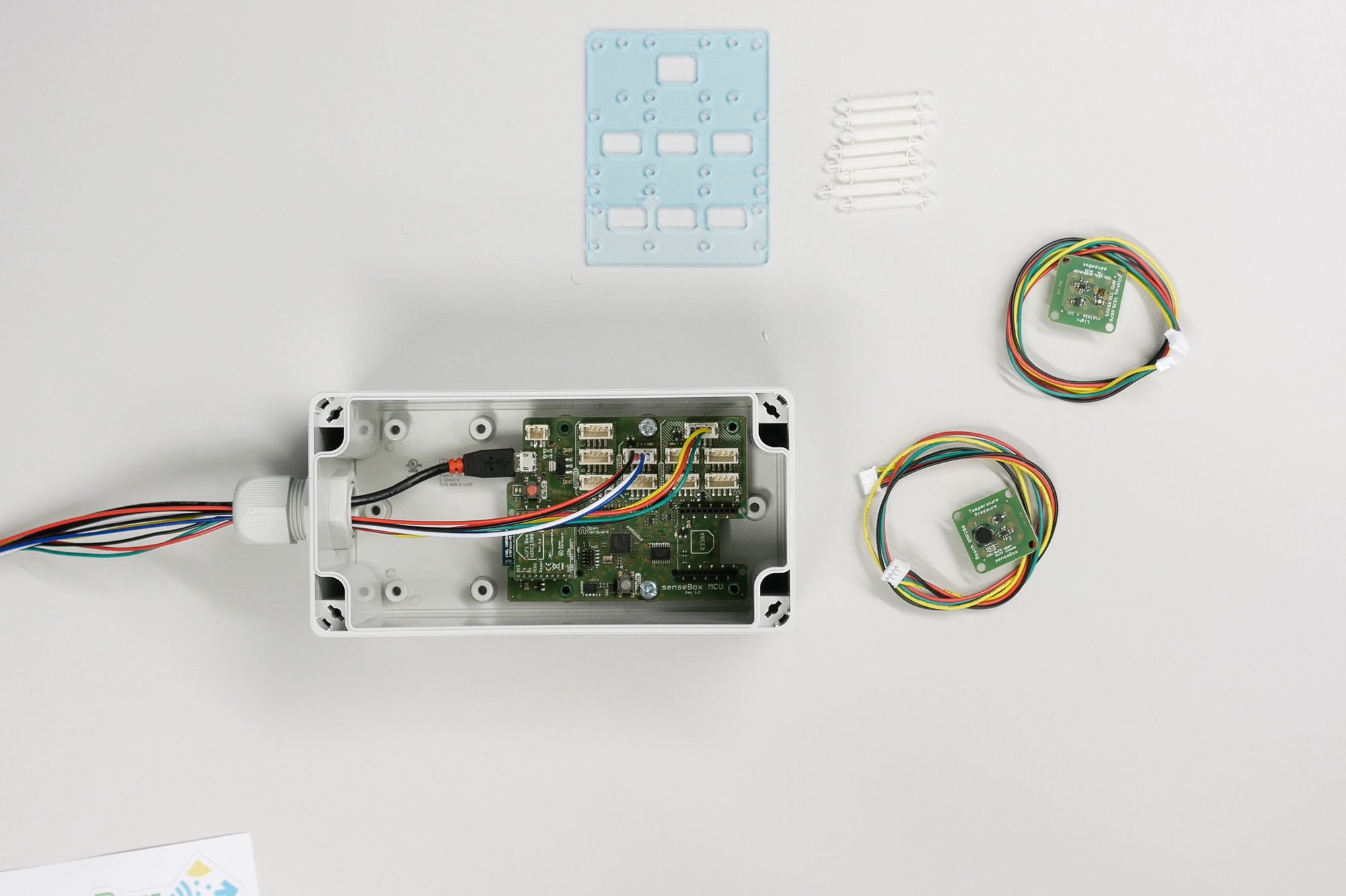 Dann wird die Montageplatte auf die Abstandshalter gedrückt und die Kabel mit den Sensoren verbunden. Die Sensoren werden mit jeweils zwei Abstandhalter ausgestattet und auf der Montageplatte befestigt. Hast du einen Lichtsensor gewählt, sollte dieser möglichst mittig im Gehäuse angebracht werden, um gute Messwerte zu erhalten. Der Luftdruck-Sensor kann in den äußeren Steckplatz.
