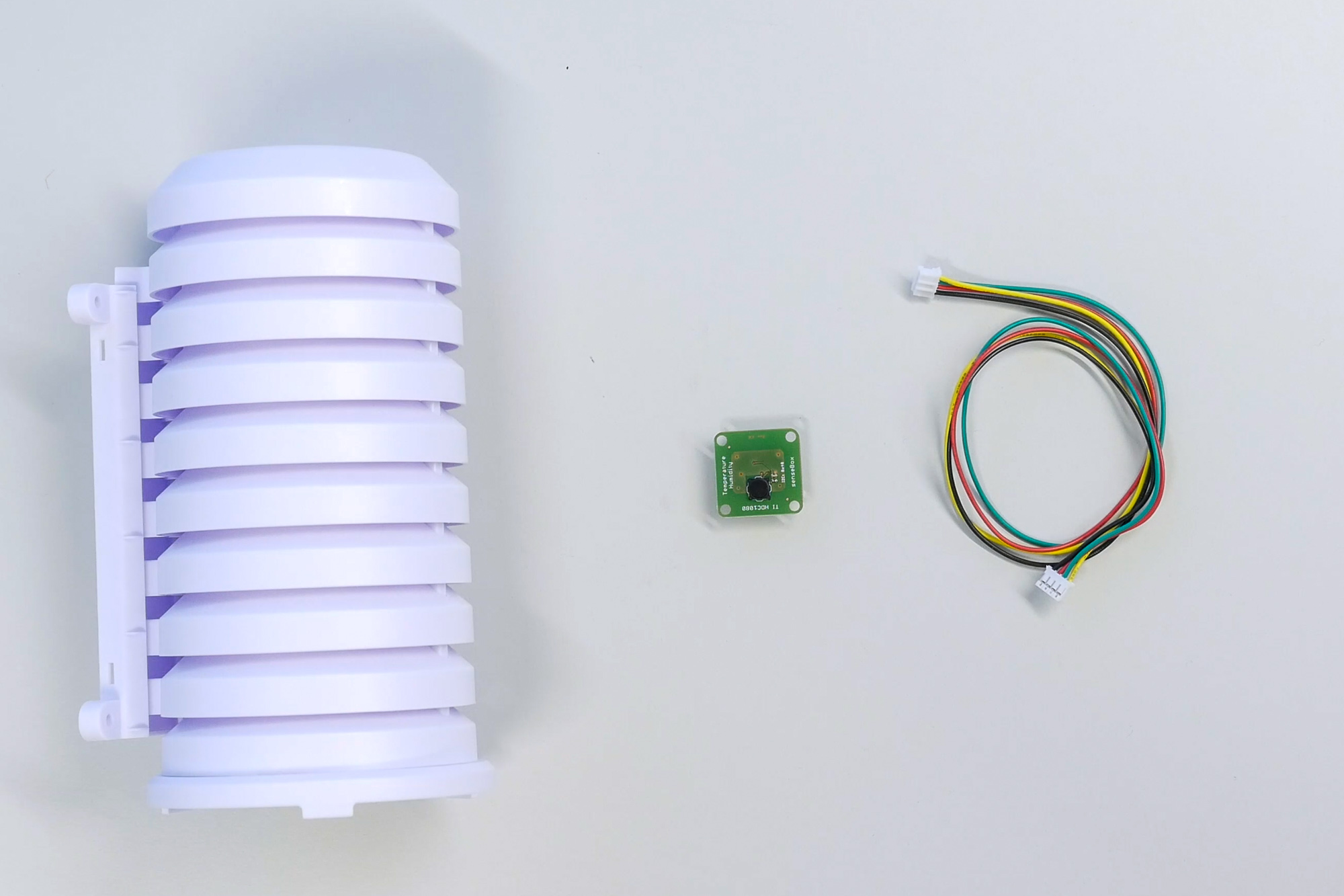 Nun zeigen wir den Aufbau des Stahlenschutz-Gehäuses, in welchem der Temperatur- und Luftfeuchtigkeitssensor angebracht wird. Im Strahlenschutz befinden sich einige Befestigungsteile, um diesen später außen anzubringen. Diese brauchen wir erstmal nicht.