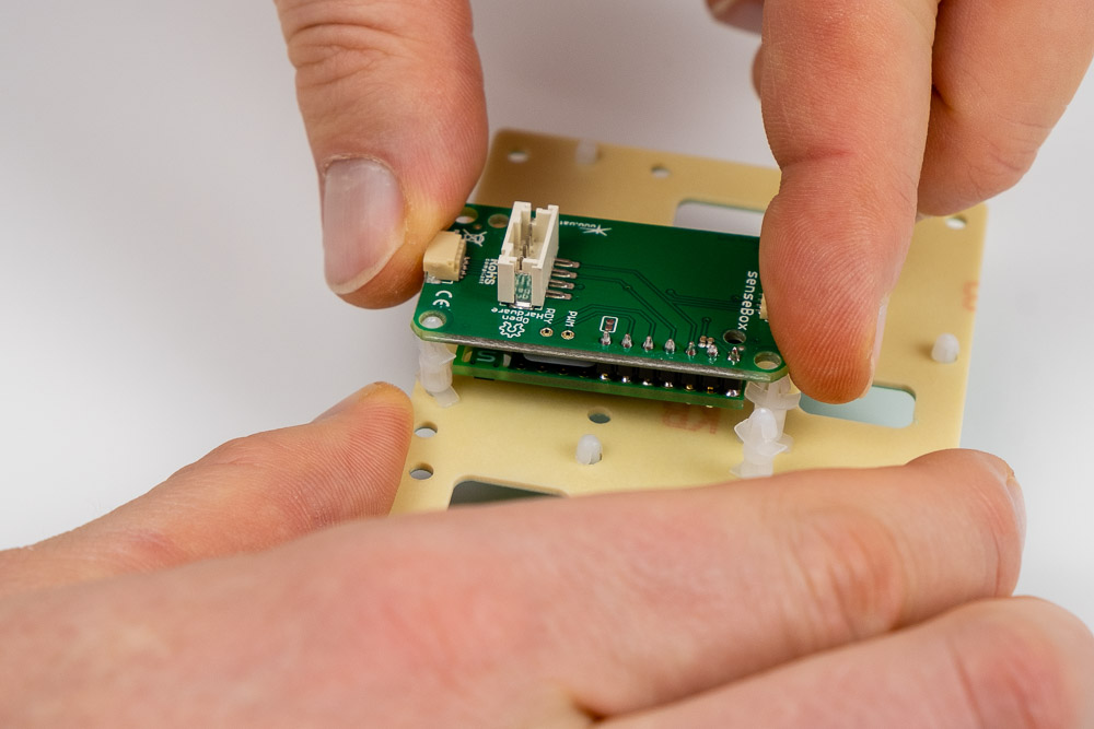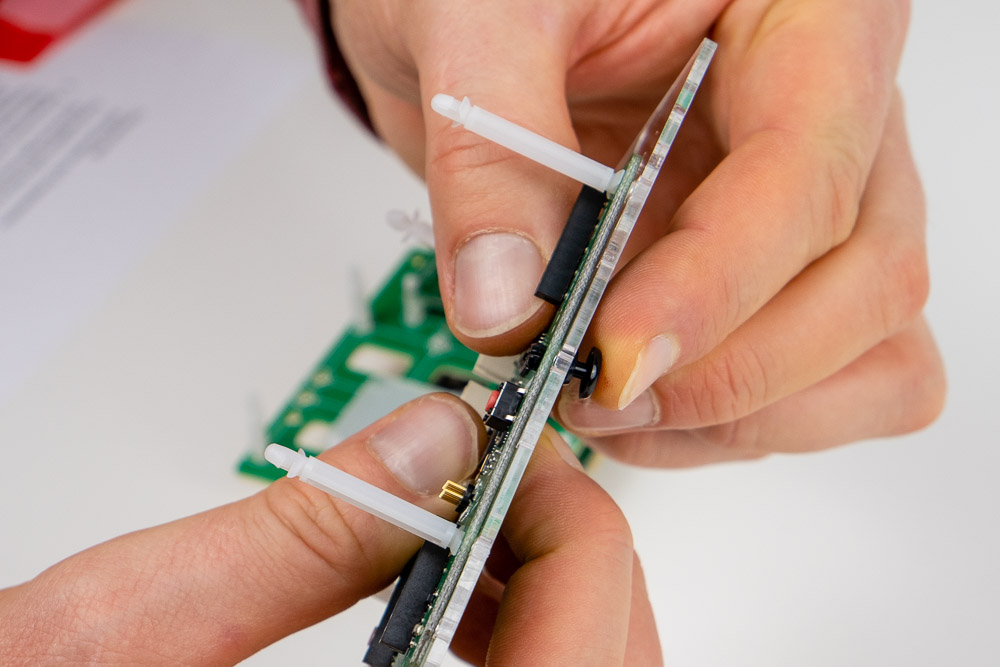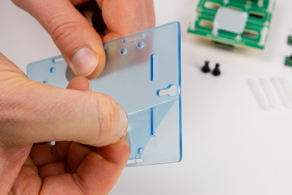 Use the black plastic clips to secure it. Insert them from below through the plexiglass plate and then through the board. Press them firmly until they snap into place: