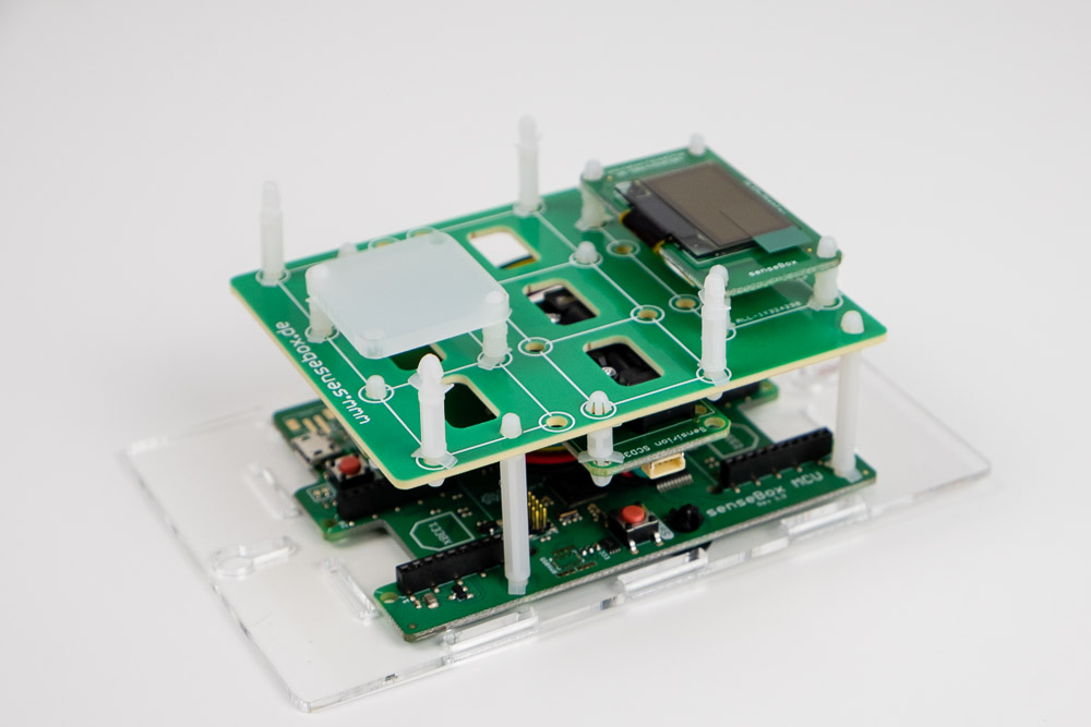 Insert the four long spacers into the corner holes of the senseBox MCU: