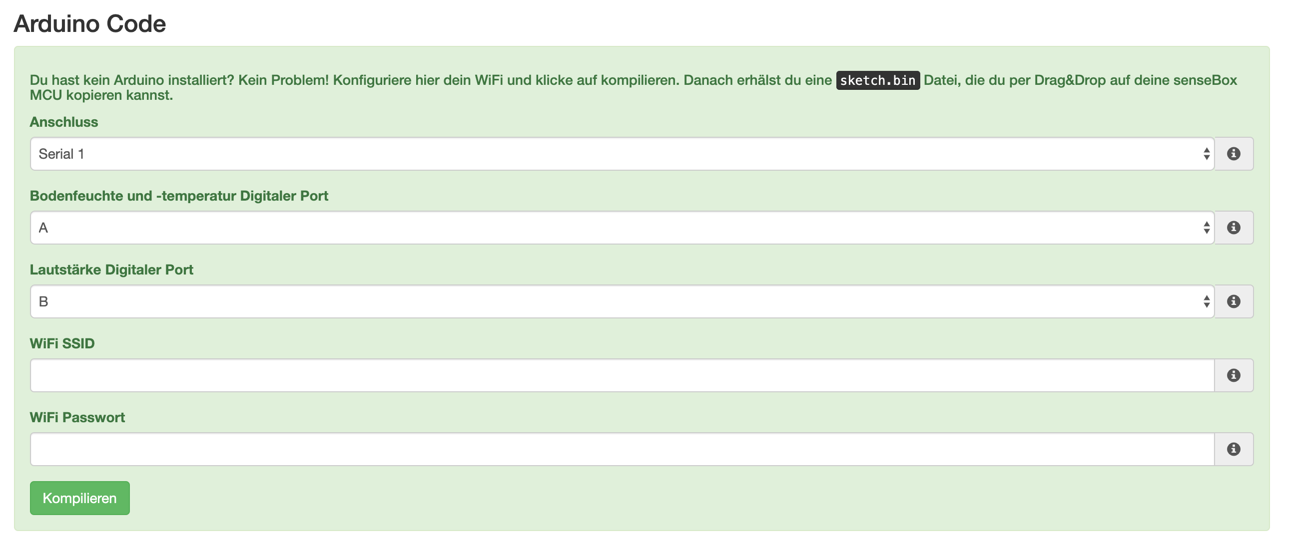 The easiest way to get your code onto the senseBox is to use our online compiler. You need to provide some information in the form. If something does not fit your individual setup of the senseBox, you can simply leave the field blank. Finally, press "Compile" and a .BIN file will be downloaded by your browser.